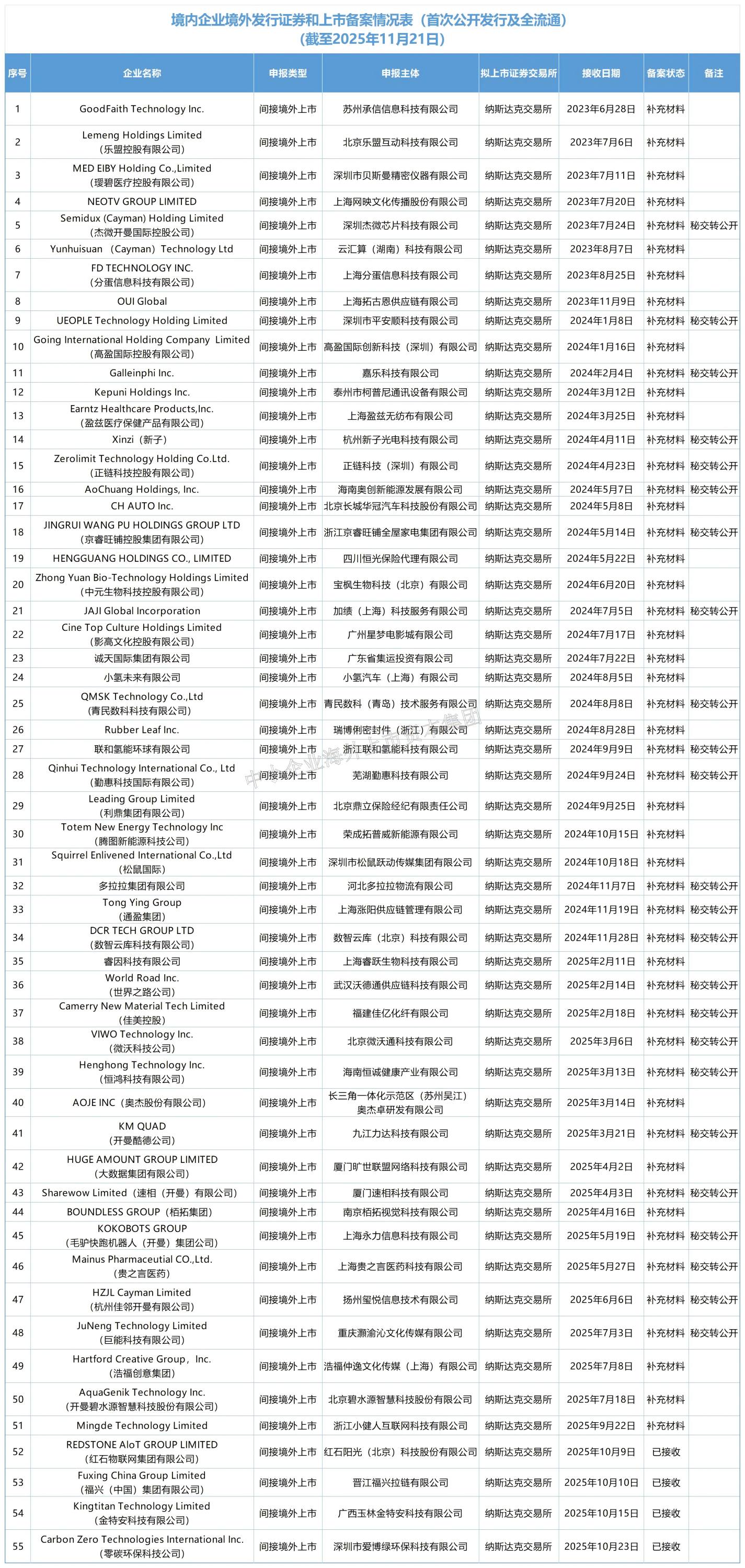 As of November 21, 2025, the filing information for overseas issuance of securities and listing by domestic enterprises released by the China Securities Regulatory Commission (CSRC) shows that a total of 358 enterprises are currently in the listing filing process, among which 55 have chosen to list on the Nasdaq Stock Market in the United States.